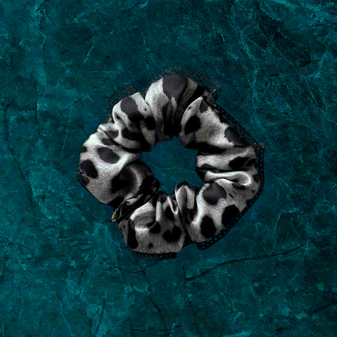 PILKA TIGRINĖ NATŪRALAUS ŠILKO SU NĖRINIAIS KLASIKINĖ PLAUKŲ GUMYTĖ